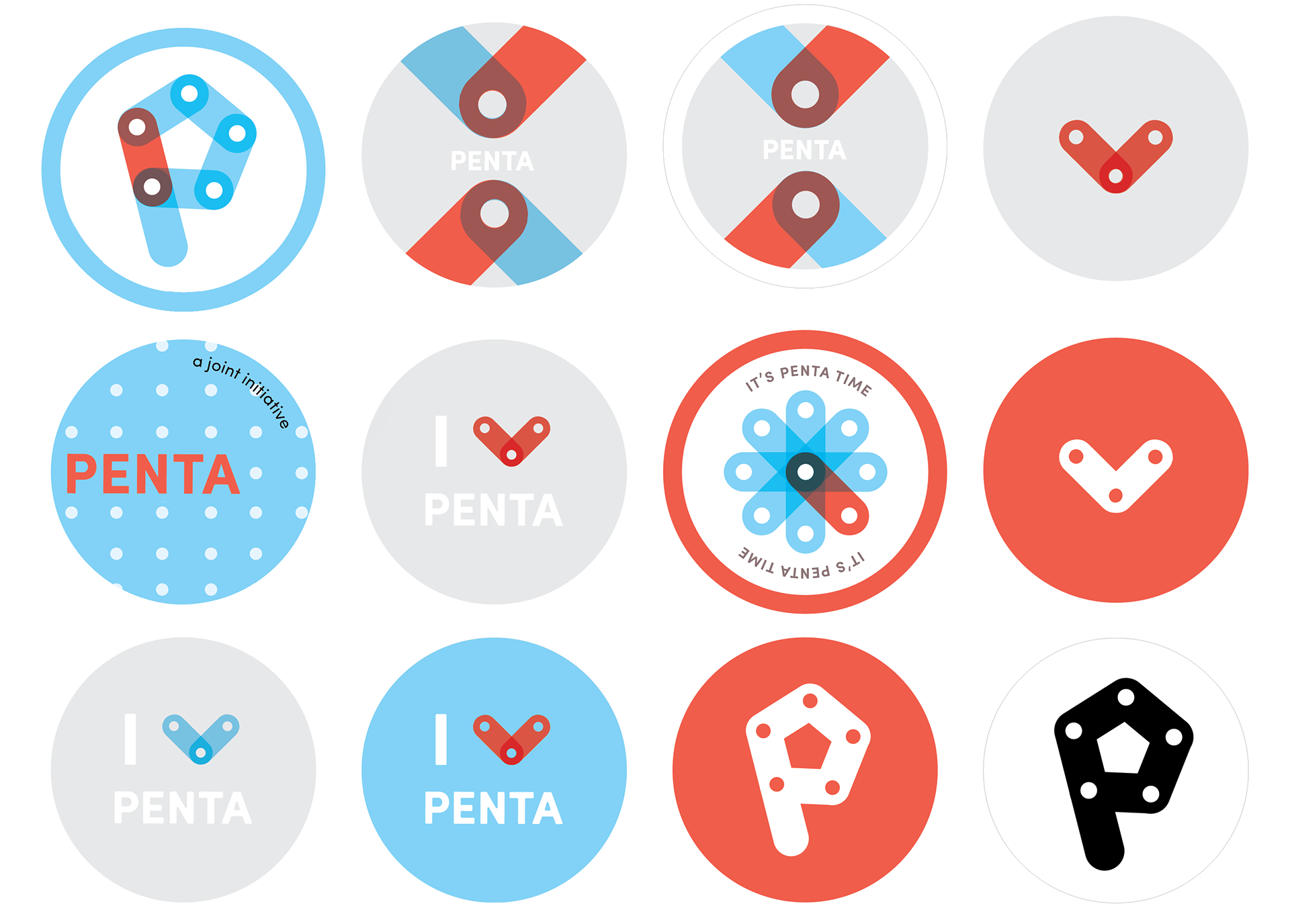 Iterations. The modular identity is inspired by Penta's vision of connecting students and prosthetics users through a rehabilitation program, and by the aesthetic of the nuts and bolts that join prosthetic legs.