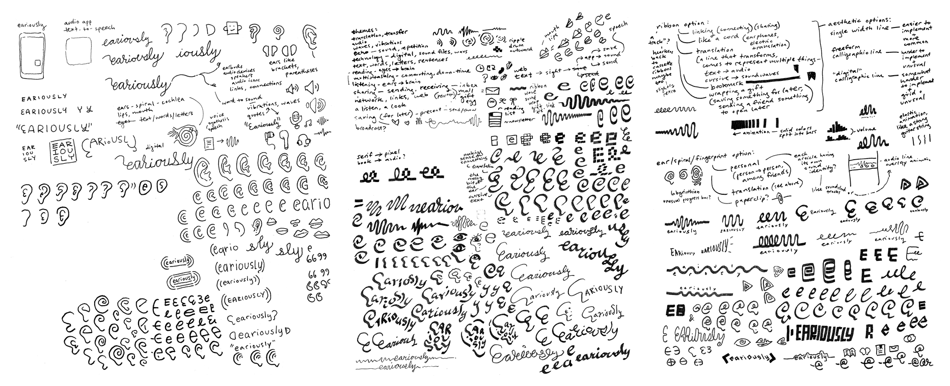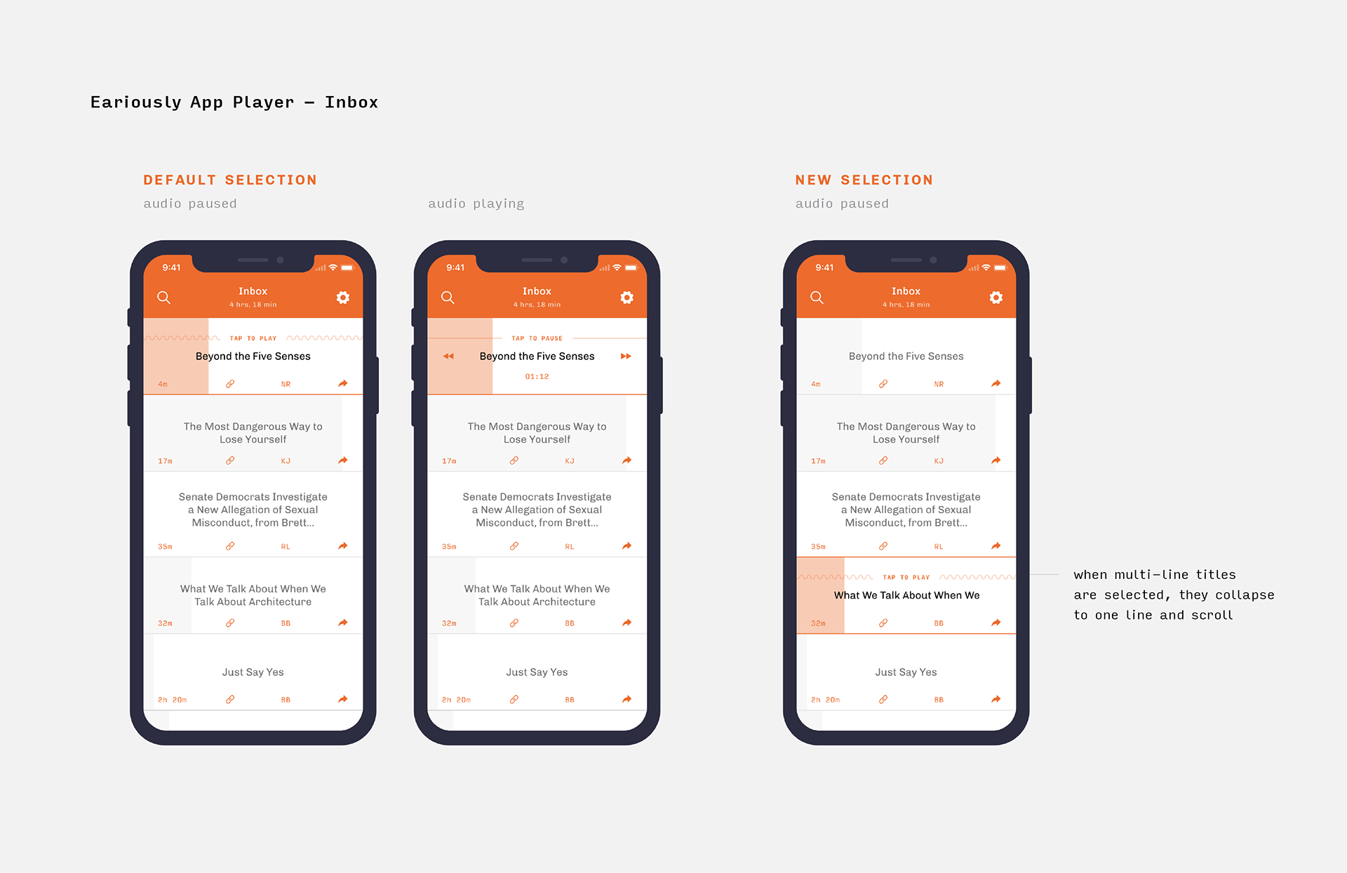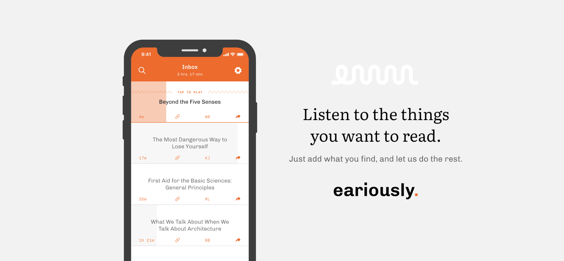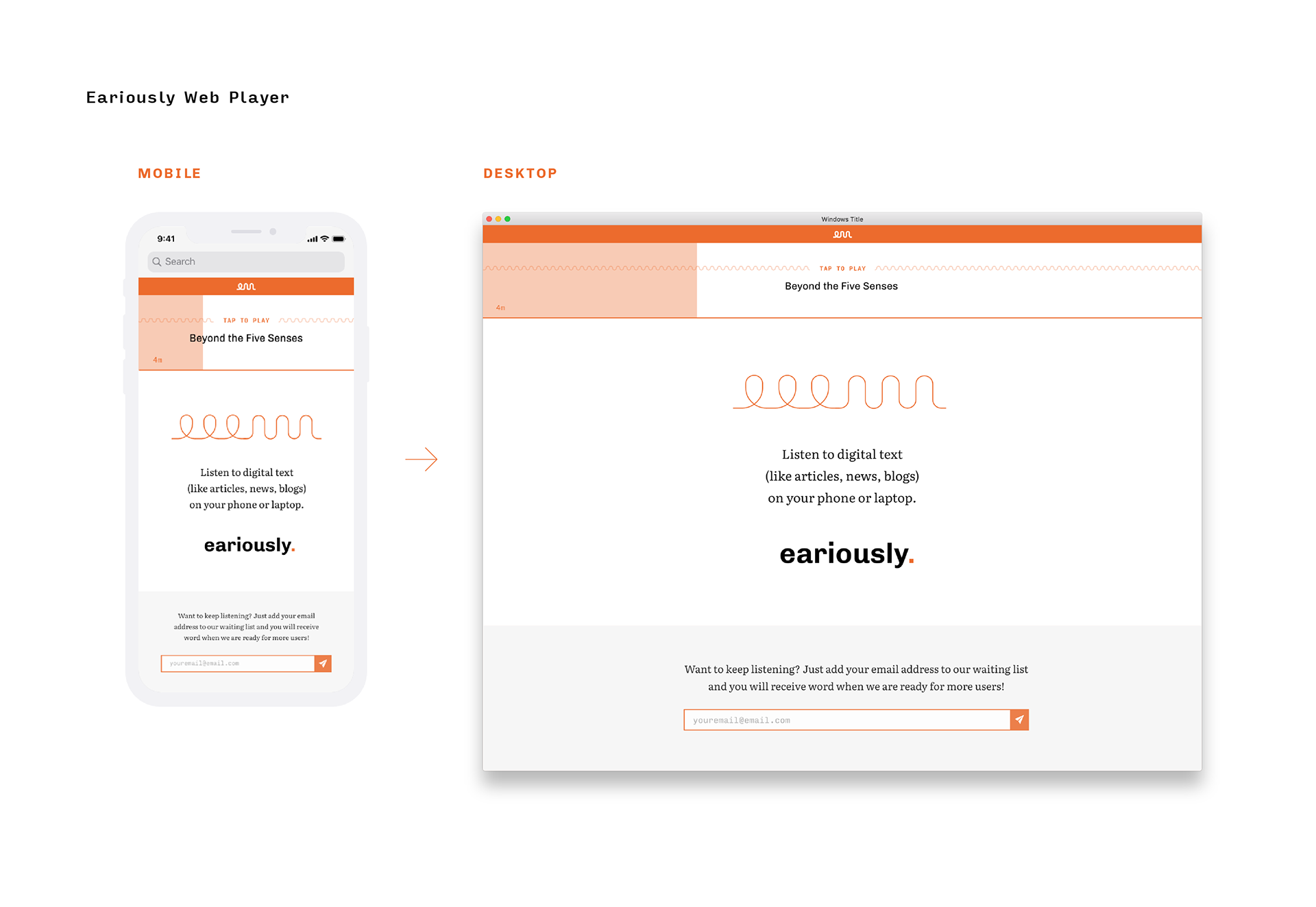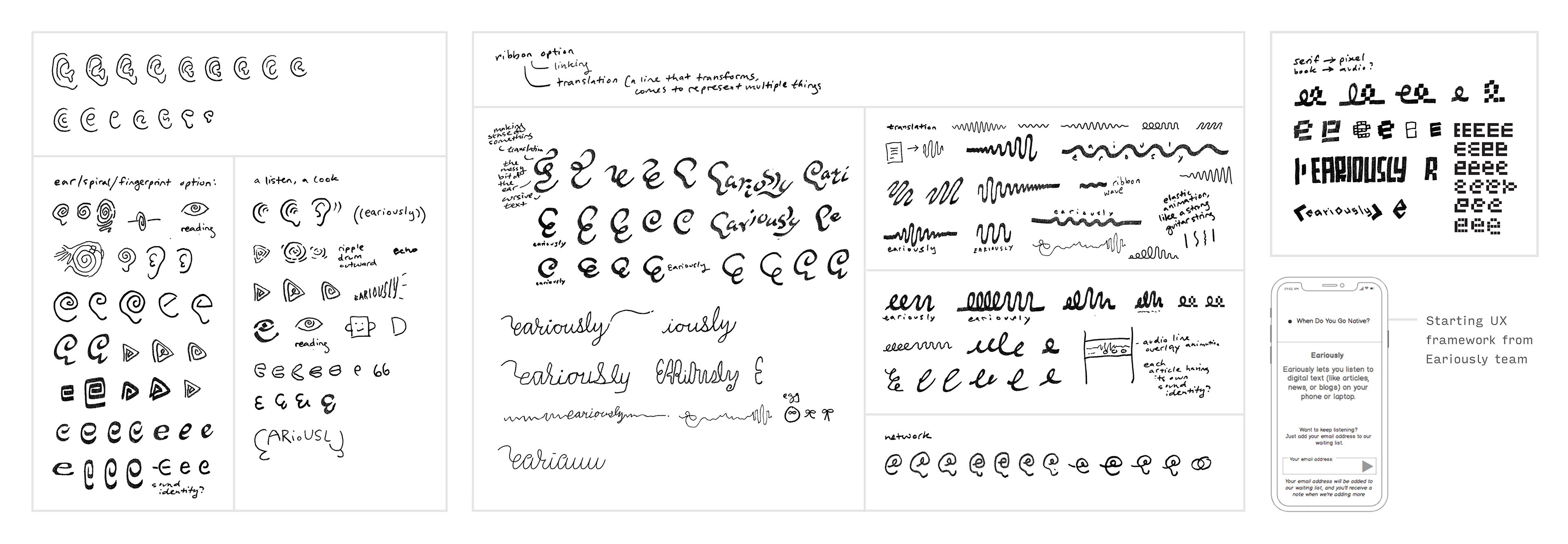Logo, branding, and mobile UI design for Eariously, an app that lets you listen to the things you want to read. App by Nick Rimsa and Brendan Barr, UX by Kia Jones, UI by me.