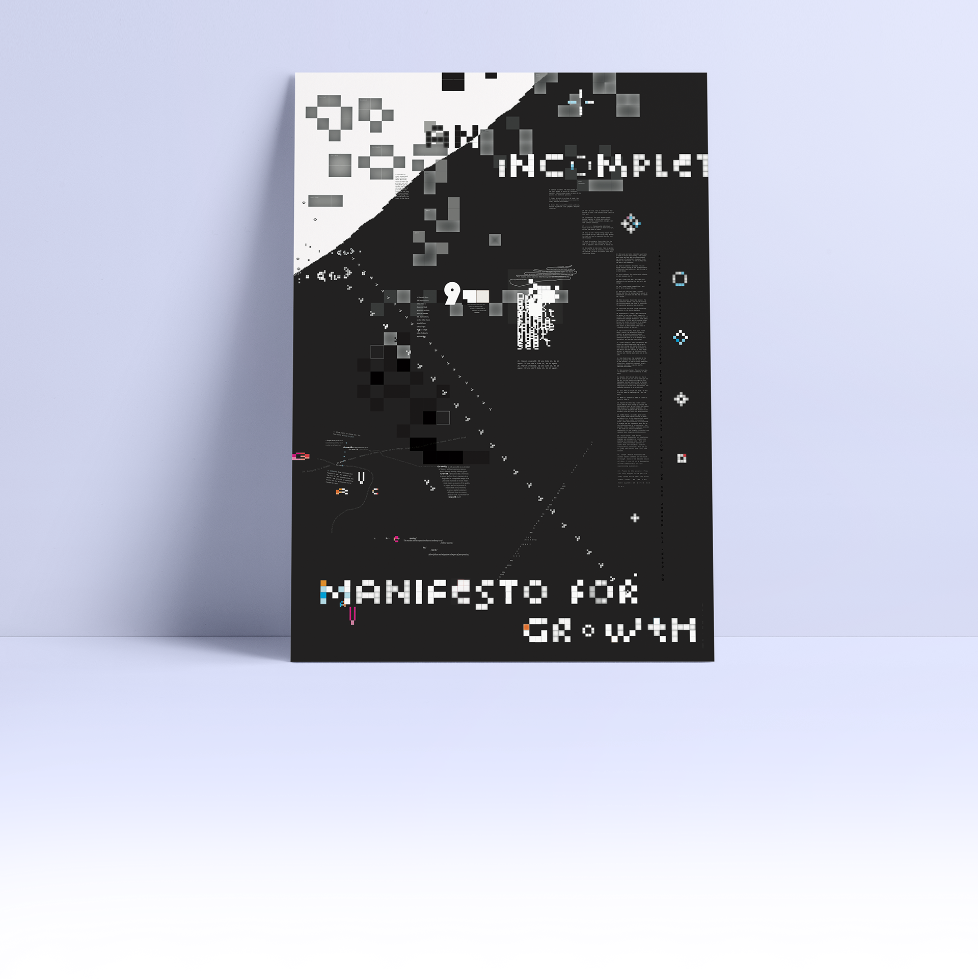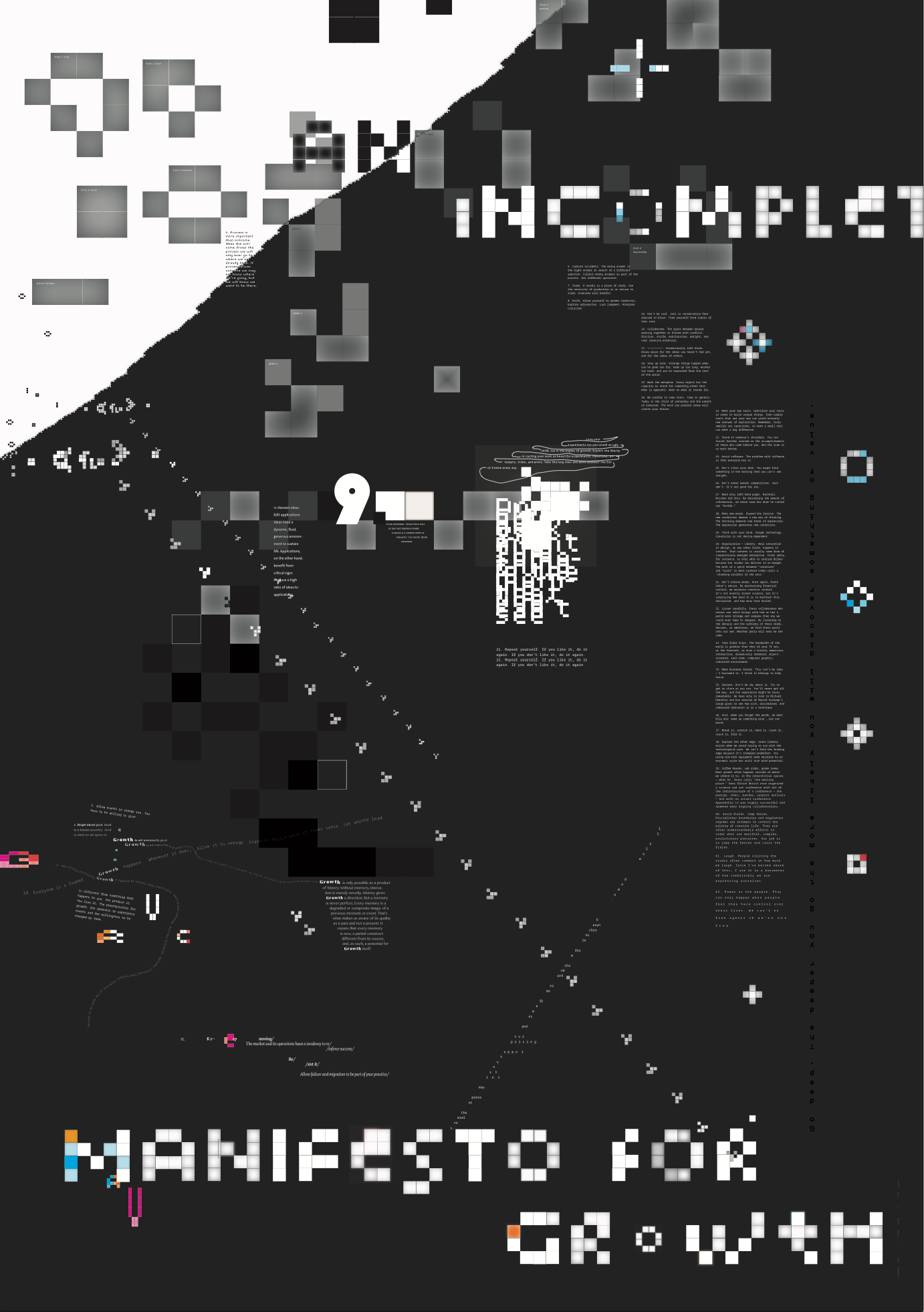A large 35"x 50" experimental poster pairing Bruce Mau's Incomplete Manifesto for Growth with Conway's Game of Life.