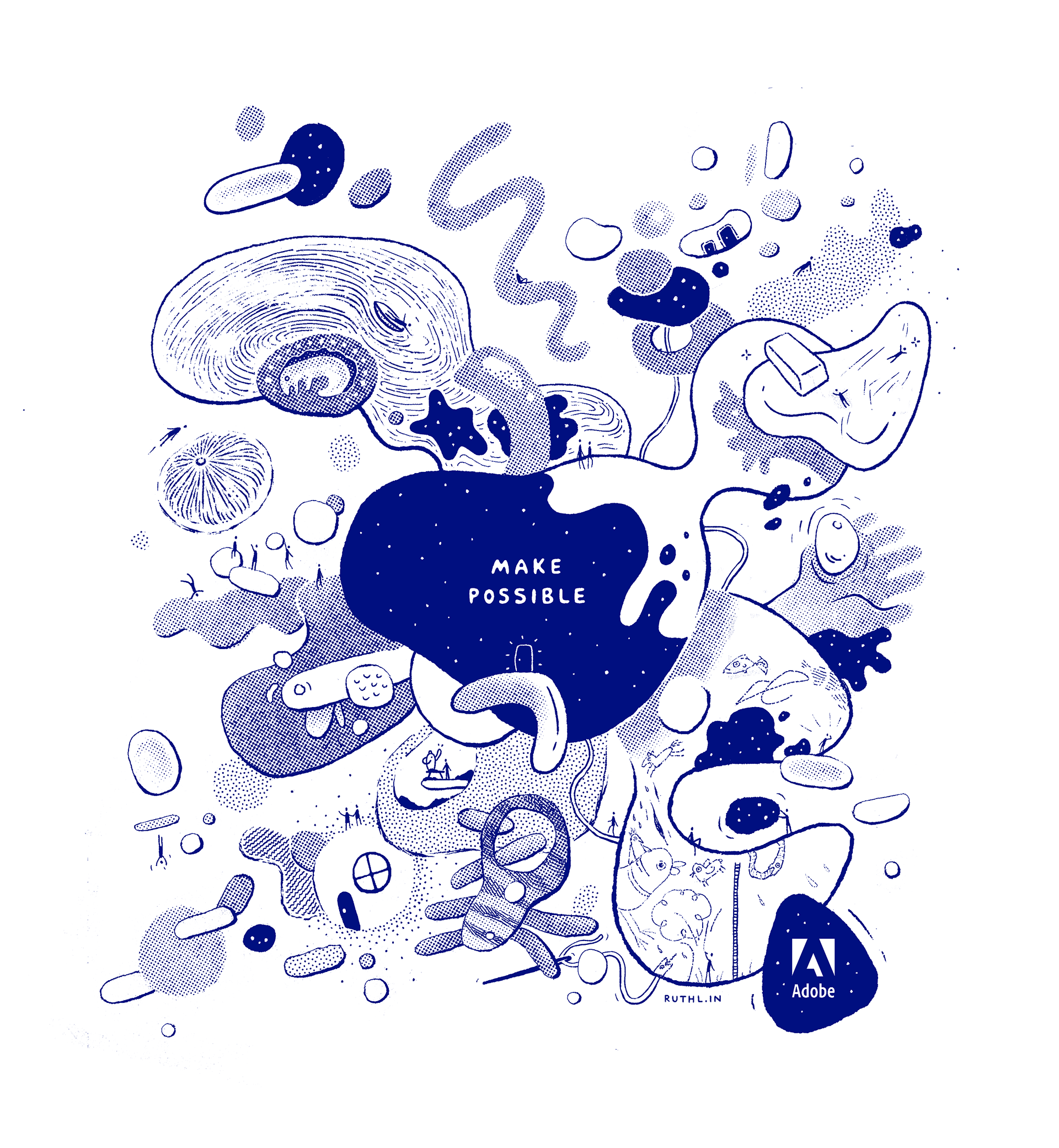 A tote bag design proposal for Adobe Max 2019, portraying tiny creators who make possible all the things in their blobby world.