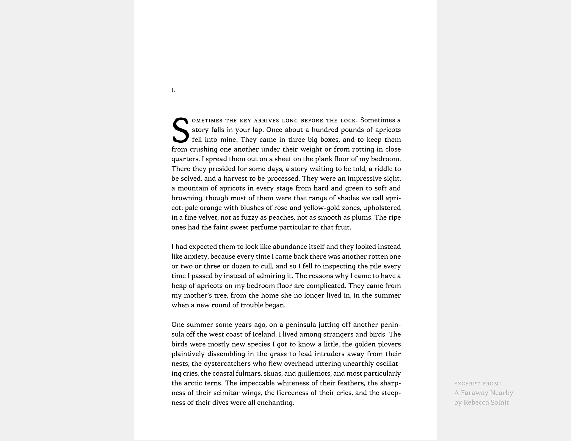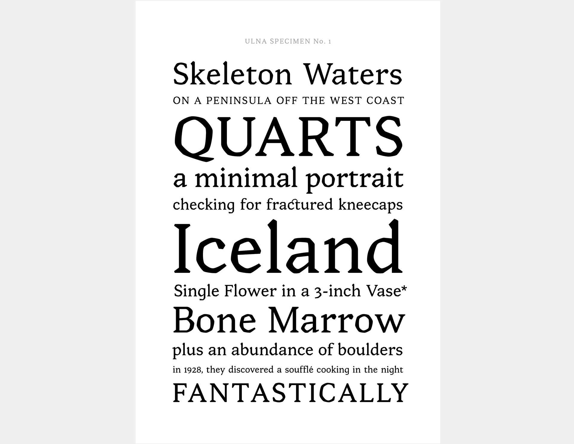 Inspired by Rebecca Solnit's A Faraway Nearby, Ulna is a typeface optimized for body text that references the rough edges of boulders, bones, and ice.